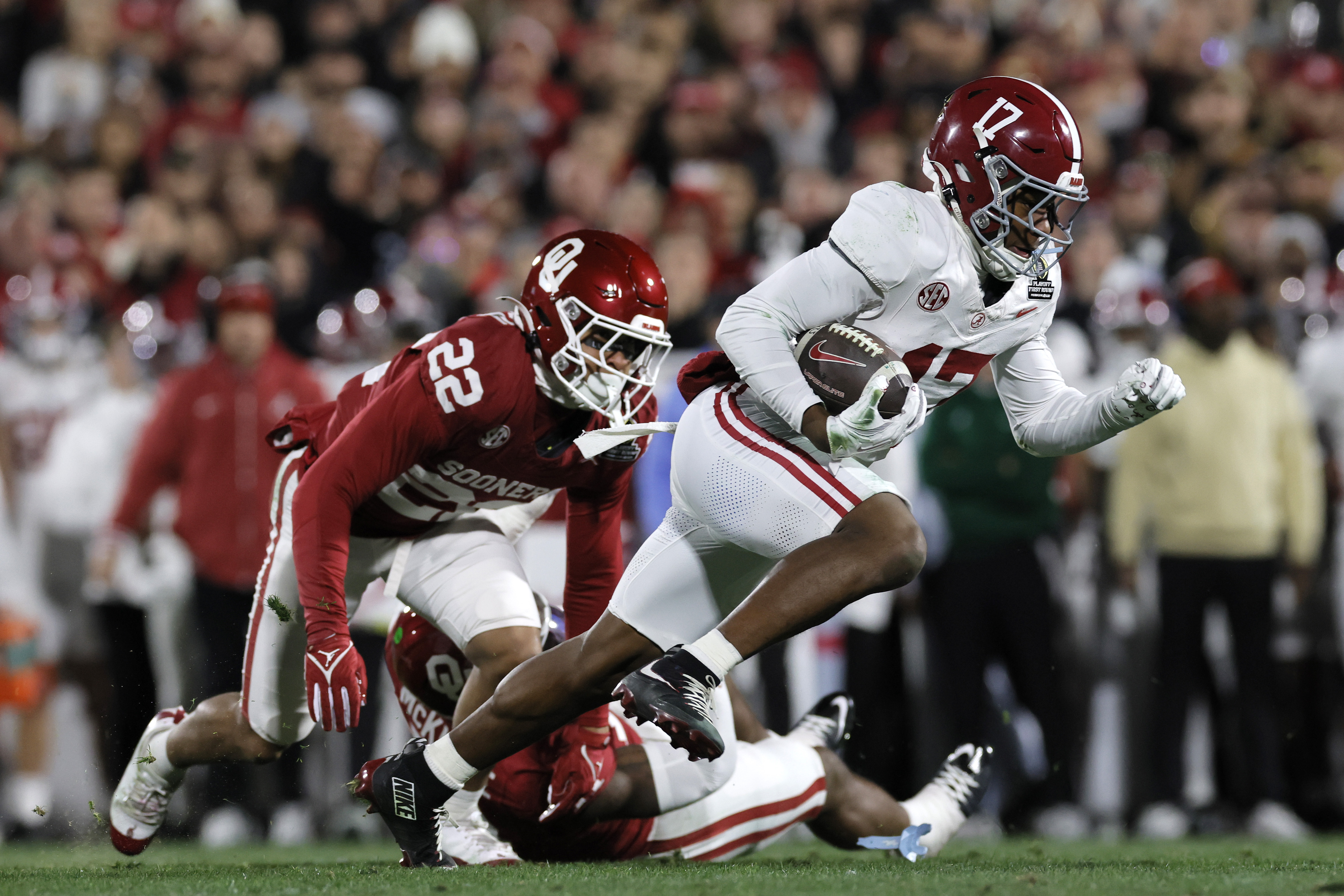 The Sooners led 17-0 with 10:51 to go in the second quarter after John Mateer hit Isaiah Sategna III for a 7-yard score. Less than 10 minutes later, Alabama had the game tied at 17-17 in the midst of a flurry that stretched through the third quarter.